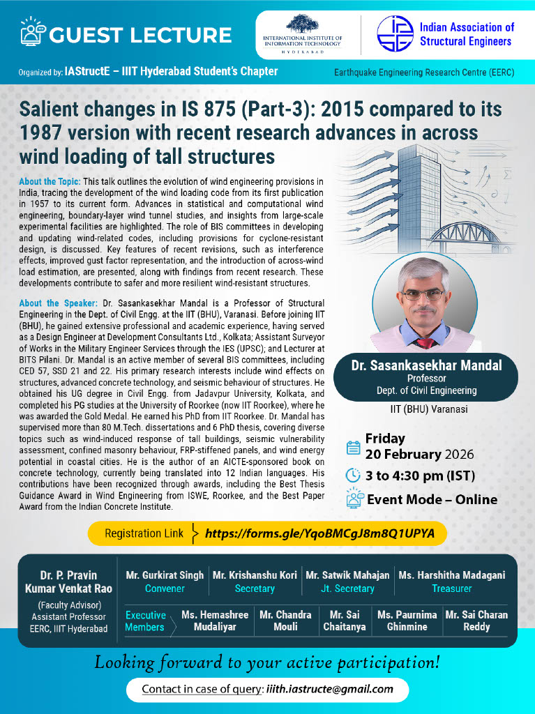 The IAStructE – IIIT Hyderabad Student’s Chapter of the Earthquake Engineering Research Centre organized an online guest lecture on “Salient changes in IS 875 (Part-3):2015 compared to its 1987 version with recent research advances in across wind loading of tall structures”, delivered by Dr. Sasankasekhar Mandal, Professor, Department of Civil Engineering, IIT (BHU), Varanasi, on 20th February 2026. The lecture focused on the key revisions introduced in IS 875 (Part 3):2015 and their implications for wind load estimation and structural design practice in India, presenting a structured comparison with the 1987 version of the code.